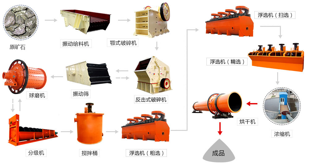 浮選工藝流程由顎式破碎機、反擊式破碎機、球磨機、分級機、攪拌桶、浮選機、濃縮機和烘干機等主要設(shè)備,配合給礦機、提升機、皮帶輸送機可組成完整的選礦生產(chǎn)線。該生產(chǎn)線具有高產(chǎn)、低能、處理量高、經(jīng)濟合理等優(yōu)點。