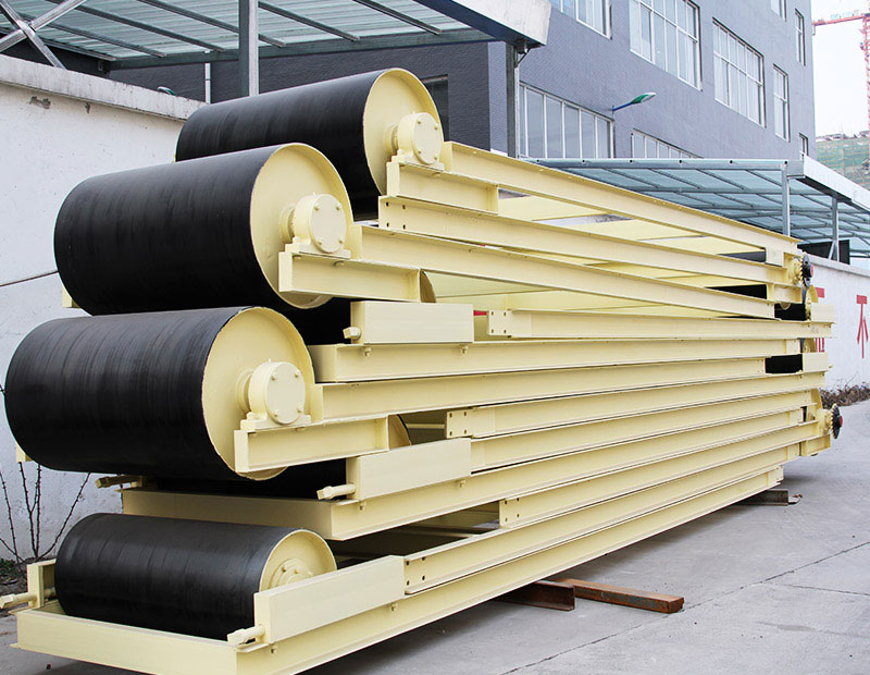 膠帶輸送機(jī)主要由機(jī)架、輸送皮帶、皮帶輥筒、張緊裝置、傳動(dòng)裝置等組成。機(jī)身采用優(yōu)質(zhì)鋼板連接而成 ,由前后支腿的高低差形成機(jī)架,平面呈一定角度傾斜。機(jī)架上裝有皮帶輥筒、托輥等,用于帶動(dòng)和支承輸送皮帶。