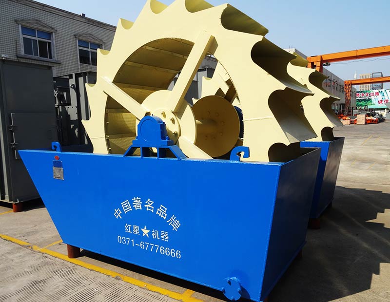 洗砂機(jī)工作時(shí),電機(jī)通過三角帶、減速機(jī)、齒輪減速后帶動(dòng)葉輪緩慢轉(zhuǎn)動(dòng),砂石由給料槽進(jìn)入洗槽中,然后在葉輪的帶動(dòng)下翻滾,并互相研磨,除去覆蓋砂石表面上的雜質(zhì),同時(shí)破壞包覆砂粒的水汽層,以利于脫水;然后同時(shí)加水,形成強(qiáng)大的水流,及時(shí)將雜質(zhì)及比重小的異物帶走,并從溢出口洗槽排出,完成清洗作用。干凈的砂石由葉片帶走,最后砂石從旋轉(zhuǎn)的葉輪倒入出料槽,完成整個(gè)砂石的清洗作用。