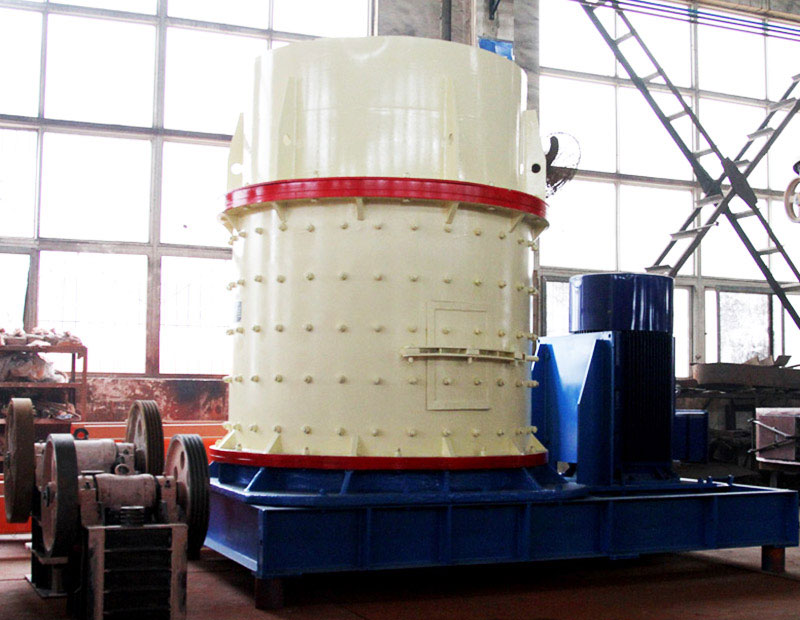 物料落入進(jìn)料斗,經(jīng)中心進(jìn)料孔進(jìn)入高速旋轉(zhuǎn)的甩輪,在甩輪內(nèi)被迅速加速,其加速度可達(dá)數(shù)十倍重力加速度,然后高速從甩輪內(nèi)射出,首先與反彈后自由下落的另一部分物料進(jìn)行撞擊,然后一起沖擊到物料襯層(石打石)或反擊塊(石打鐵)上,被反彈斜向上沖擊到渦流腔的頂部,又改變其運動方向,偏轉(zhuǎn)向下運動,又與從葉輪流道發(fā)射出來的物料撞擊形成連續(xù)的物料幕。這樣,一塊物料在渦流破碎腔內(nèi)受到兩次至多次幾率撞擊、摩擦和研磨破碎作用。被破碎的物料由下部排料口排出。