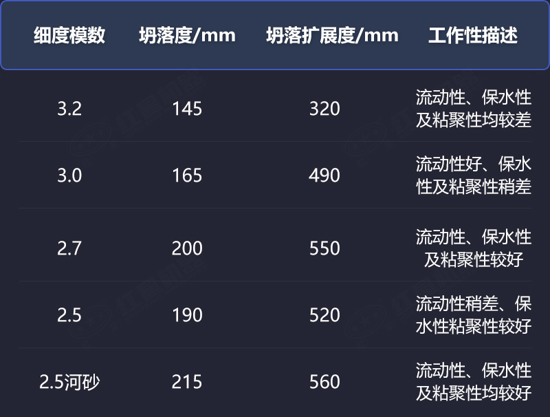 2、機(jī)制砂細(xì)度模數(shù)大于3.0時(shí),新拌機(jī)制砂混凝土和易性差,易出現(xiàn)離析、泌漿及包裹性差等風(fēng)險(xiǎn),細(xì)度模數(shù)小于2.7時(shí),混凝土的流動(dòng)性降低。