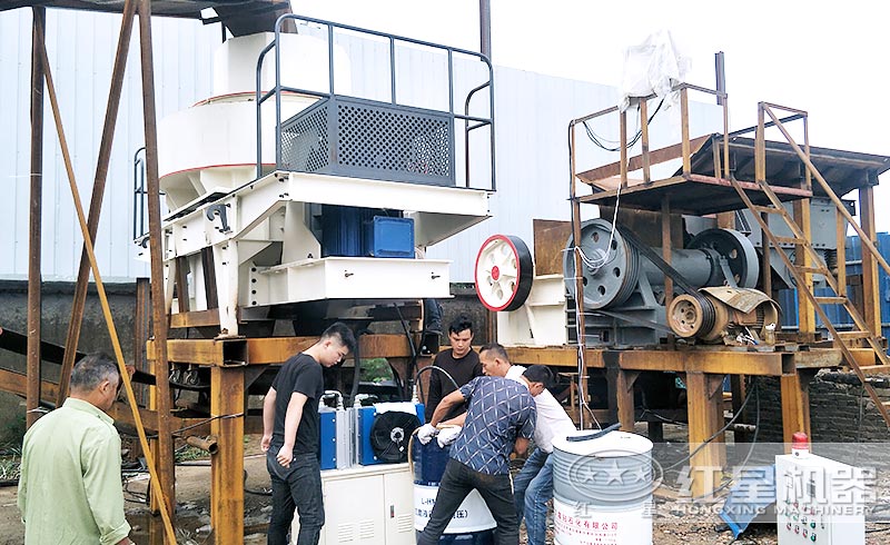 設(shè)備配置:顎破+制砂機(jī)+振動(dòng)篩+輸送機(jī)
